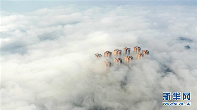 當(dāng)日,銅仁市萬(wàn)山區(qū)上空出現(xiàn)平流霧景觀,建筑物、山巒在霧氣中若隱若現(xiàn)。新華社發(fā)(伍衛(wèi)東攝)
