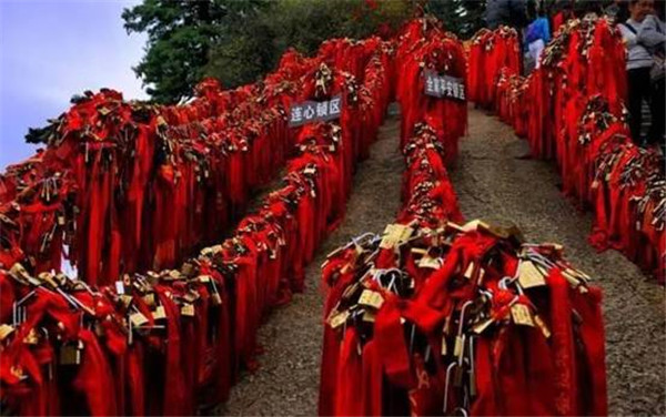 金鎖關(guān)——登山路兩側(cè)鐵索上情侶鎖,重重疊疊,紅繩彩線迎風搖曳,在這里,鎖住你們對愛情的誓言,表達隊愛情忠貞!