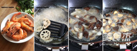 主料:雞翅中6個 大蝦6個 木耳60克 藕100克 豆皮100克 青筍200克 鮮香菇100克 西蘭花100克 菜花100克 金針菇1小把