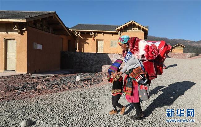 在昭覺縣三河村易地扶貧安置點,馬海阿依帶著女兒搬進新居(2月11日攝)。2月11日,三河村首批29戶、168人告別居住多年的土坯房,搬入易地扶貧安置點的新家。新華社記者 江宏景 攝