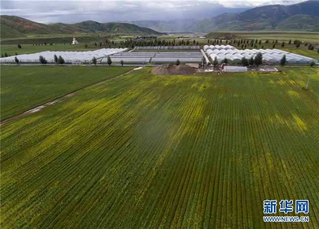 這是理塘縣濯桑鄉(xiāng)濯桑現(xiàn)代農(nóng)業(yè)雙創(chuàng)中心(2018年8月11日無人機拍攝)。理塘縣甲洼鎮(zhèn)、濯桑鄉(xiāng)等鄉(xiāng)鎮(zhèn)集中使用產(chǎn)業(yè)扶持資金,跨村集中抱團發(fā)展設(shè)施蔬菜大棚,讓貧困人口在園區(qū)獲得穩(wěn)定收益。新華社記者 江宏景 攝