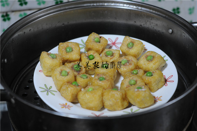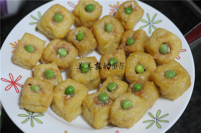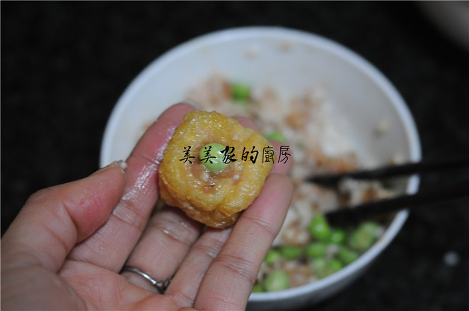 4.油豆腐表面用筷子撮一個(gè)洞,將拌好的餡慢慢塞入油豆腐里,盡量塞滿(mǎn),在洞口上塞上一顆青豆裝飾。