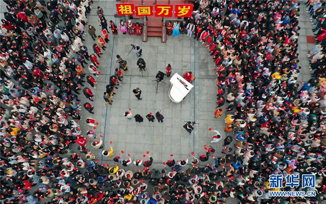 2月25日,湖南省衡陽(yáng)市南華大學(xué)師生在開學(xué)主題活動(dòng)上齊唱《我和我的祖國(guó)》(無(wú)人機(jī)拍攝)。 新華社發(fā)(曹正平 攝)