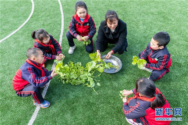 2月25日,在重慶市南川區(qū)慶元鎮(zhèn)福壽村小,教師黃先群和孩子們清洗他們?cè)谛@里種的蔬菜,為午飯做準(zhǔn)備,這所“微小學(xué)”只有一名教師和五名學(xué)生。新華社發(fā)(瞿明斌 攝)