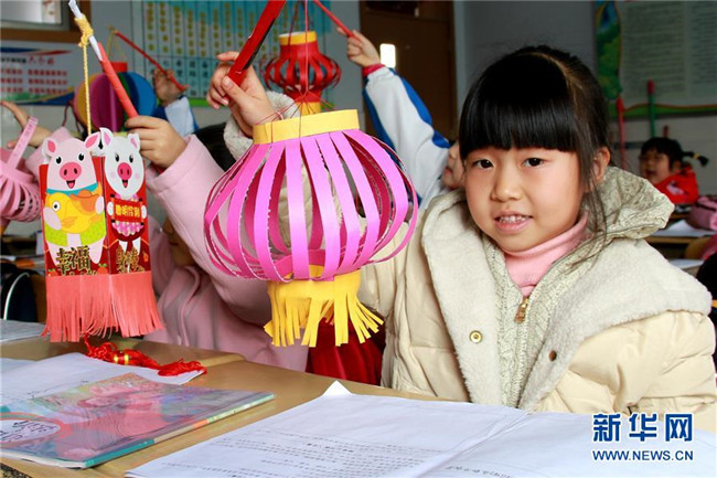 2月25日,在山東青島西海岸新區(qū)第二實(shí)驗(yàn)小學(xué),學(xué)生在開學(xué)第一課上展示自己制作的春節(jié)主題作品。新華社發(fā)(王培珂 攝)