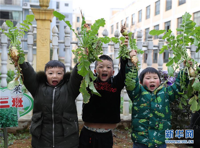 2月25日,在貴州省銅仁市玉屏侗族自治縣平溪街道第二幼兒園,孩子們?cè)陂_學(xué)主題活動(dòng)上展示自己拔的蘿卜。新華社發(fā)(胡攀學(xué) 攝)