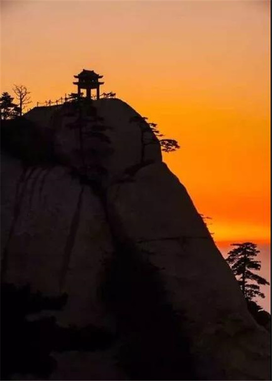 此時,但見夜幕自東方悄然隱退,晨曦初露,漸漸霞光瑰麗,云源奔涌。瞬間,一輪火球噴薄而出,繼而光芒四射,氣象萬千,整個世界大放光明,游人身心為之一振。待云霧散盡,蒼松翠柏,則更加清麗悅目,美妙神奇。故而,游名山者必登華山,登華山者必觀日。