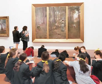 在墨爾本當?shù)氐拿佬g(shù)館,孩子們圍坐在一起,聽老師講解畫作。