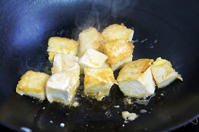 4.炒鍋加入適量的油,每一片豆腐都裹上蛋液,入鍋煎