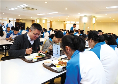 “我可以坐在這兒嗎?”3月25日中午,海淀區(qū)教師進(jìn)修學(xué)校附屬實(shí)驗(yàn)學(xué)校校長董紅軍在學(xué)生窗口打完飯后,找了一個位置坐下。記者了解到,今年2月份,學(xué)校開始實(shí)行副校級干部的輪流陪餐制度,董紅軍是當(dāng)日輪崗的干部。