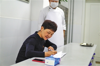 安樂幼兒園園長張萍試吃幼兒午餐并進(jìn)行記錄評價。新京報(bào)記者 馮琪 攝