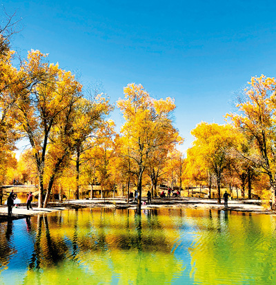甘肅金塔胡楊林是三北防護(hù)林體系的一部分。圖為2018年10月9日,游人在金塔森林公園觀賞胡楊林美景。王 春攝(人民視覺(jué))