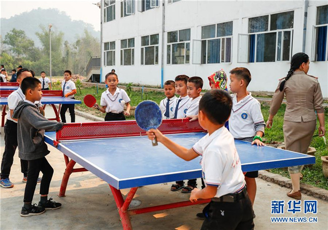 3月22日,在老撾孟賽的中老友誼學(xué)校,學(xué)生在課間休息時打乒乓球。新華社記者 王婧嬙 攝