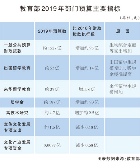 關(guān)于資金來源,教育部2019年部門預(yù)算顯示,2019年一般公共預(yù)算財政撥款約為1527億元,比上年執(zhí)行數(shù)增加約95億元。其主要原因為生均綜合定額、出國留學經(jīng)費以及學生資助工作專項等支出增加。