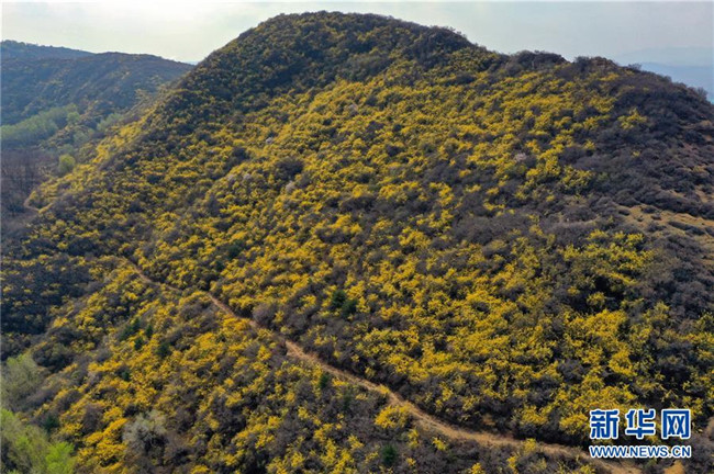 連翹花盛開在平定縣冠山上(4月10日無人機拍攝)。