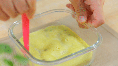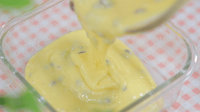 9.將山藥糊倒入模具中。 8分滿就可以了,因?yàn)樯剿幐庹艉煤髸?huì)微微膨脹的。