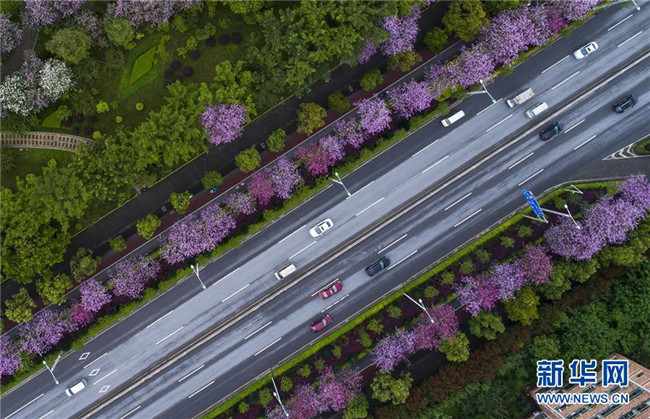 4月14日,在廣西柳州市學(xué)院路,車(chē)輛在開(kāi)滿(mǎn)洋紫荊的街道上行駛(無(wú)人機(jī)拍攝)。