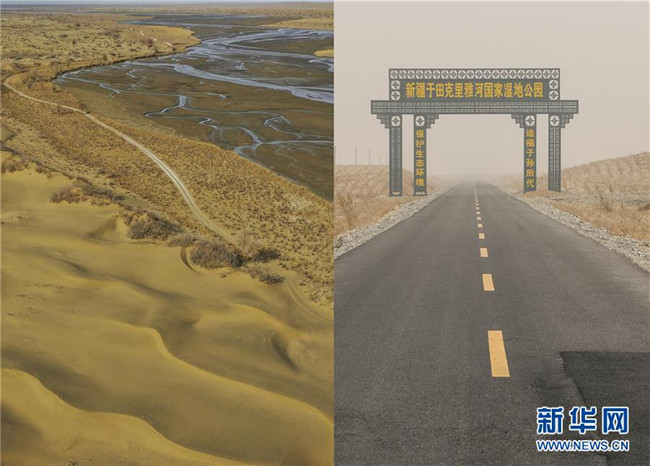 拼版照片:左圖為沿著克里雅河通向地處沙漠深處新疆于田縣達(dá)里雅布依鄉(xiāng)的路(3月19日無(wú)人機(jī)拍攝);右圖為從縣城通往達(dá)里雅布依小鎮(zhèn)易地扶貧安置點(diǎn)的柏油路(3月20日攝)。新華社記者 胡虎虎 攝