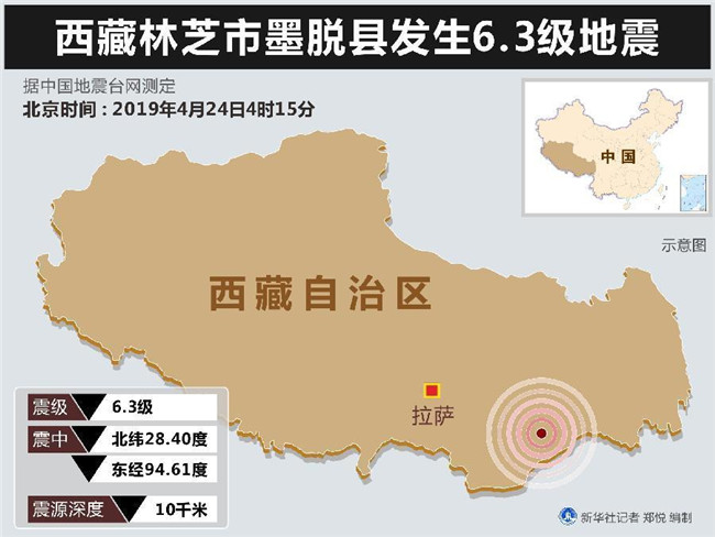 4月24日4時(shí)15分,在西藏林芝市墨脫縣(北緯28.40度,東經(jīng)94.61度)發(fā)生6.3級(jí)地震,震源深度10千米。林芝消防力量已趕赴震中應(yīng)急處置,向當(dāng)?shù)亓私獾那闆r顯示,中心區(qū)域震感強(qiáng)烈。(記者葉昊鳴)