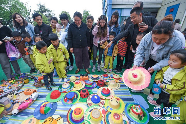 4月28日,家長帶著孩子們?cè)谔暨x喜歡的手工作品。 新華社記者 徐昱 攝