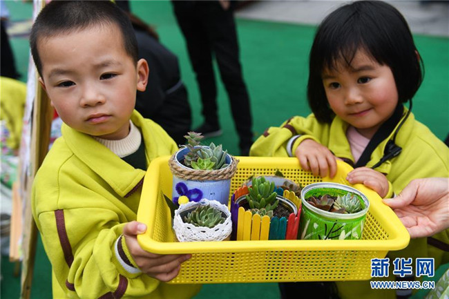 4月28日,孩子們?cè)谡故居脧U舊罐子等作花盆的小盆栽。 新華社記者 徐昱 攝