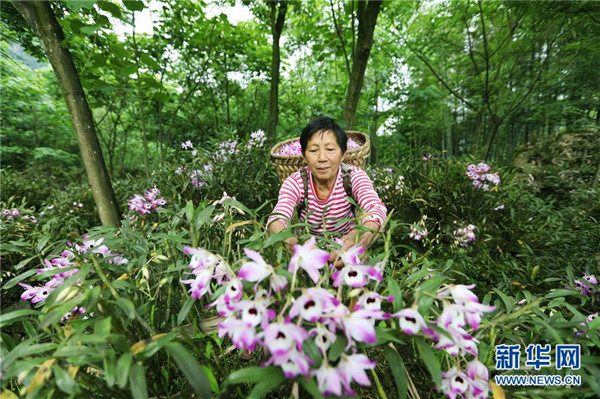 5月4日,在貴州省赤水市白云鄉(xiāng)田渡村,農(nóng)戶在采摘金釵石斛鮮花。
