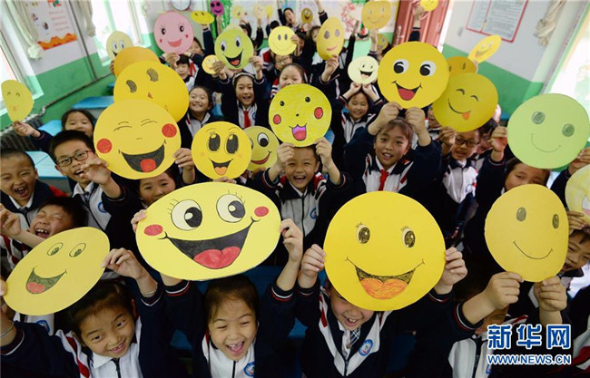 5月7日,河北省邯鄲市光明南小學(xué)的學(xué)生在展示笑臉卡。新華社發(fā)(郝群英 攝)