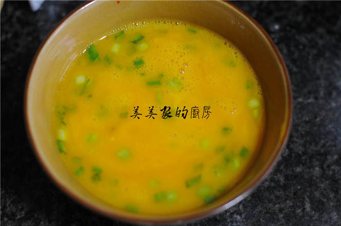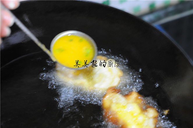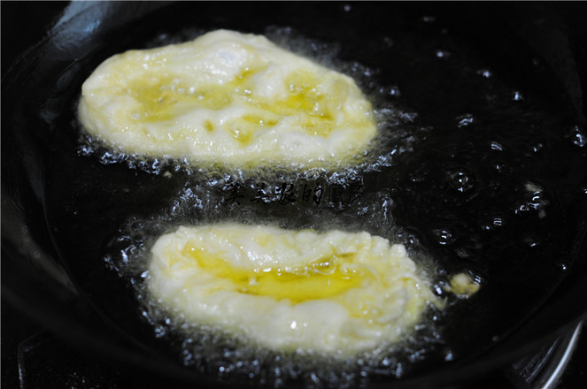 7.面團底部微微焦黃,凹洞里面微微炸熟后,舀起一勺蛋液倒入凹洞中,不停地往蛋液上澆油,炸制熟透后出鍋瀝干油即可。
