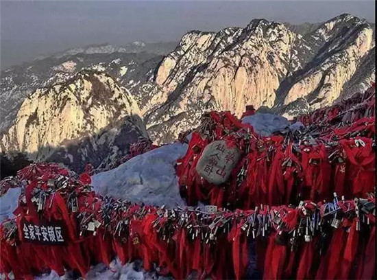 華山的金鎖關(guān)建在三峰口的一座石拱門處,關(guān)北接五云峰,南控華山主峰,東西兩側(cè)壑深千丈,是名副其實(shí)的咽喉要道。杜甫《望岳》詩(shī)中“箭栝通天有一門”指的就是這里。道家認(rèn)為,華岳為仙鄉(xiāng)神府,只有過(guò)了通天門,才算進(jìn)入仙境,所以便有“過(guò)了金鎖關(guān),另是一重天”的民謠。