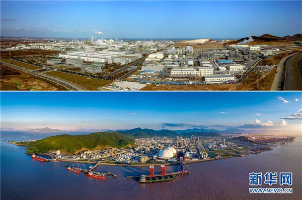 上圖:萬華煙臺工業(yè)園航拍畫面(2018年12月4日無人機拍攝,新華社記者郭緒雷攝);下圖:萬華寧波公司全景圖(資料照片)。新華社發(fā)