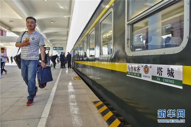 5月30日,在新疆塔城火車站,旅客準(zhǔn)備登上塔城—烏魯木齊K9858次列車。新華社發(fā)(擺風(fēng)亮 攝)