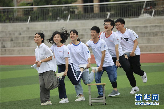 6月1日,湖南省永州市道縣一中高三學(xué)生參加單腿跳游戲。新華社發(fā)(王滋創(chuàng) 攝)