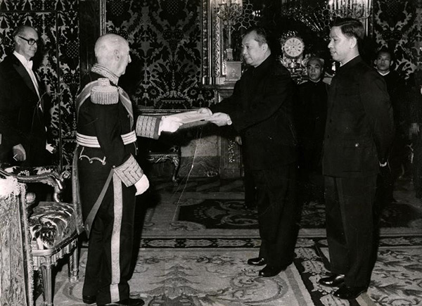 1973年,王珍陪同中國(guó)首任駐西班牙大使陳肇源向西班牙國(guó)家元首佛朗哥遞交國(guó)書(shū)。(圖片由王珍提供)