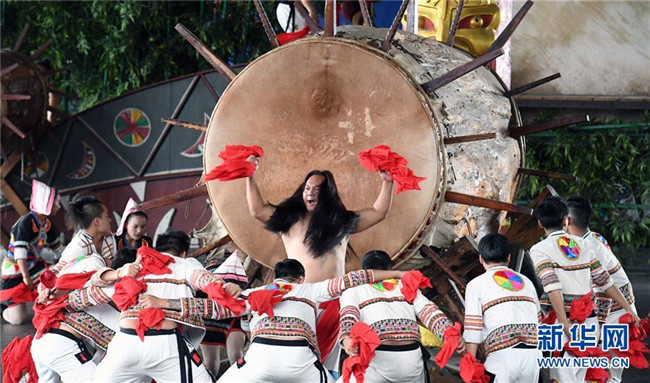 基諾族演員在表演大鼓舞(6月1日攝)。