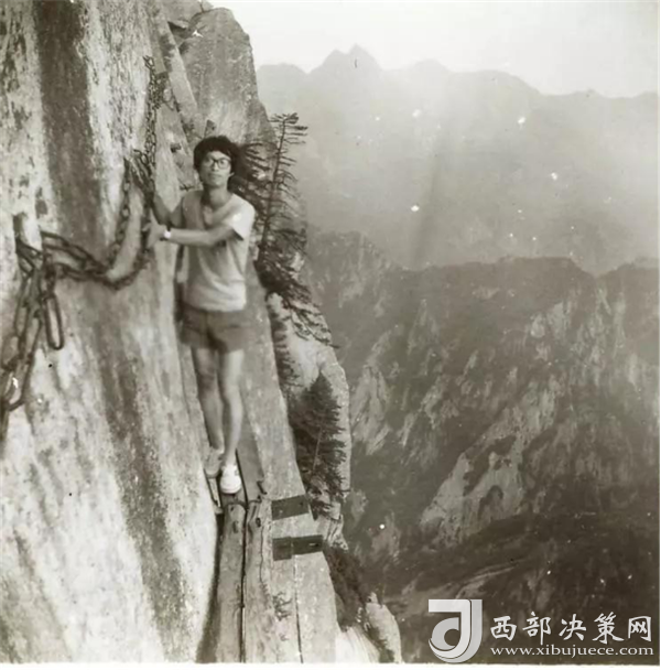 我照相的時候,一只手抓鐵鏈,一只手做動作,身體是緊貼石壁。難得的是當(dāng)年一起去的一個女生給我照相,在我對面一樣危險,但女俠單手抓鐵鏈,整個身體外突懸在半空中,另一只手拿相機找一個最好角度給我拍照,我都替她擔(dān)心。——摘自網(wǎng)友2003年爬華山的游記