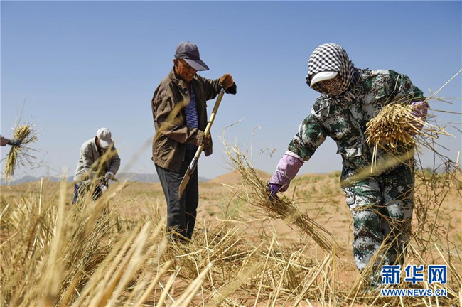 在寧夏中衛(wèi)市長(zhǎng)流水沙區(qū),治沙工人在沙漠中搬運(yùn)麥草(6月13日攝)。新華社記者馮開(kāi)華攝