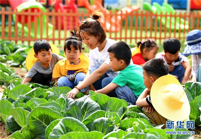 6月17日,樂亭縣大相各莊鄉(xiāng)幼兒園老師在勞動(dòng)實(shí)踐基地的小菜園里給孩子們講解甘藍(lán)菜的生長(zhǎng)過程。新華社記者楊世堯攝