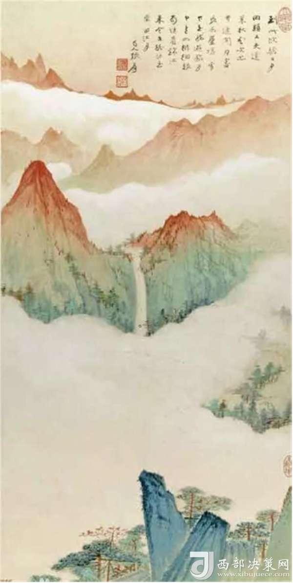 《華山云?!愤@幅山水畫是由中國著名山水畫家張大千先生創(chuàng)作,該幅山水畫作品圖也是畫家作品當(dāng)中出類撥萃的的精品之一,描繪了華山旭日東升的云海。