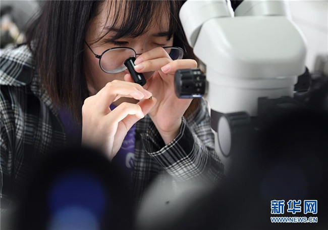 在長(zhǎng)安大學(xué)珠寶鑒定實(shí)驗(yàn)室,地質(zhì)學(xué)專業(yè)寶玉石學(xué)與珠寶鑒定方向的學(xué)生在觀測(cè)樣本(5月28日攝)。新華社記者張博文攝