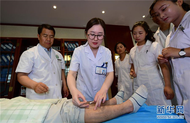 在陜西中醫(yī)藥大學(xué)附屬醫(yī)院名醫(yī)館,針灸推拿學(xué)專業(yè)學(xué)生王娟(左二)在教授雷正權(quán)的指導(dǎo)下練習(xí)針刺(6月4日攝)。新華社記者李一博攝