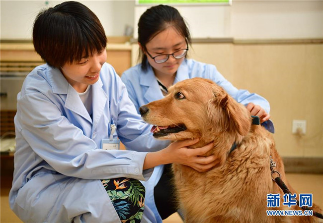西北農(nóng)林科技大學(xué)動(dòng)物醫(yī)學(xué)專業(yè)學(xué)生在學(xué)校的動(dòng)物醫(yī)院內(nèi)安撫一只寵物狗(5月25日攝)。新華社記者邵瑞攝