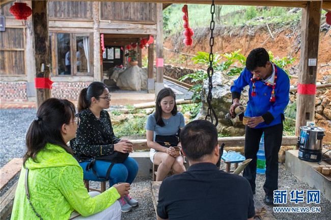 在云南省芒市三臺(tái)山德昂族鄉(xiāng)出冬瓜老寨,趙臘退(右)在民宿招呼客人(6月19日攝)。新華社記者 胡超 攝