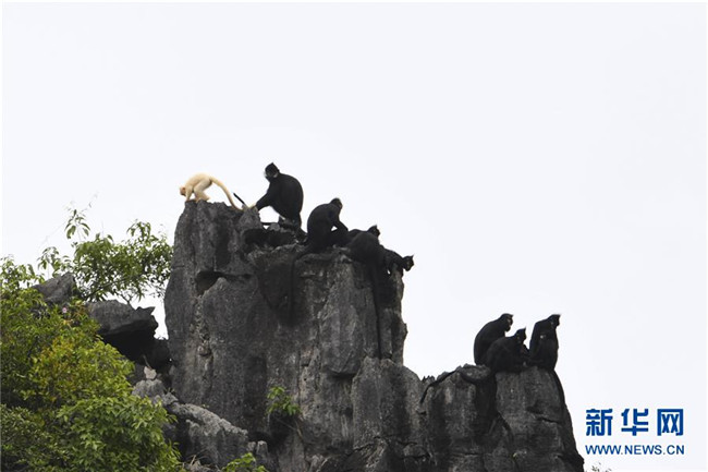 7月4日,白化黑葉猴幼體和同種群其他黑葉猴出現(xiàn)在廣西大新縣桃城鎮(zhèn)寶新村城南小學(xué)后山上。新華社記者 曹祎銘 攝
