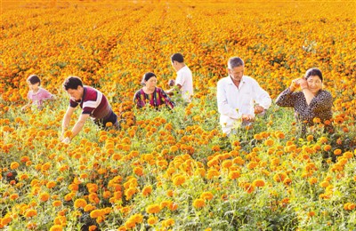 近年來,新疆維吾爾自治區(qū)的莎車晨光生物公司通過“公司+基地+合作社+農(nóng)戶”的形式帶動(dòng)農(nóng)民大面積種植萬壽菊,7年來累計(jì)帶動(dòng)農(nóng)民增收6億多元,實(shí)現(xiàn)出口創(chuàng)匯4357萬美元,繳納稅金1200多萬元,使5萬多貧困戶擺脫了貧困。圖為7月18日,莎車縣的維族群眾正在采摘被他們譽(yù)為“致富花”的萬壽菊。本報(bào)記者史家民攝