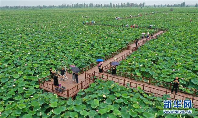 在江西省南昌市新建區(qū)聯(lián)圩鎮(zhèn),游客在當(dāng)?shù)氐那М€荷花園觀賞游玩(7月20日無人機(jī)拍攝)。