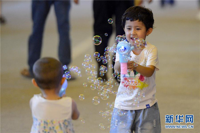 小朋友在吐魯番市長(zhǎng)沙·葡萄主題公園夜市玩耍(7月16日攝)。