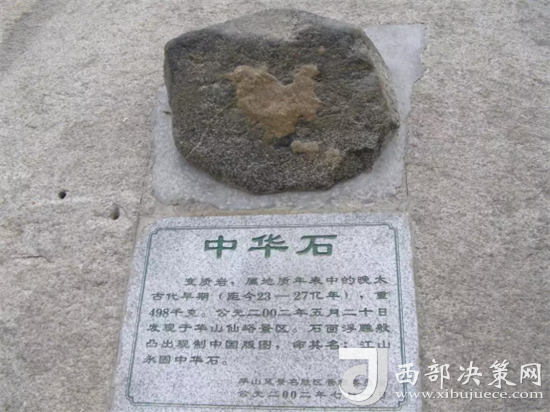 “中華石”于2002年5月20日在華山仙峪景區(qū)被發(fā)現(xiàn)。在淡墨色花崗巖石面上,浮雕般凸現(xiàn)出一塊白色石圖,此圖酷似現(xiàn)制中國版圖,十分形象通真。該石重約498千克,云母花崗巖石,大約形成于三千萬年前的白堊時期,現(xiàn)置北峰。(供稿:華旅集團營銷中心)