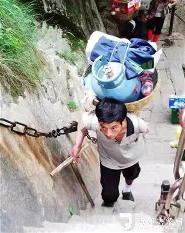可是,有一群人,每天背著幾十斤重的貨物在華山上下,如履平地,數(shù)十年如一日,這就是華山上的別樣風景---挑山工。一副扁擔、一根長繩,或者一個背簍、一根登山用的手杖就是華山挑山工掙錢養(yǎng)家的家伙什。