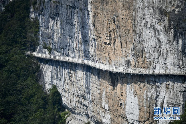 游客在重慶金佛山風(fēng)景區(qū)內(nèi)的絕壁棧道上游覽體驗(yàn)(8月20日攝)。重慶市南川區(qū)的金佛山風(fēng)景區(qū)屬典型的喀斯特地貌,風(fēng)景秀美,吸引了不少游客。新華社記者劉潺攝