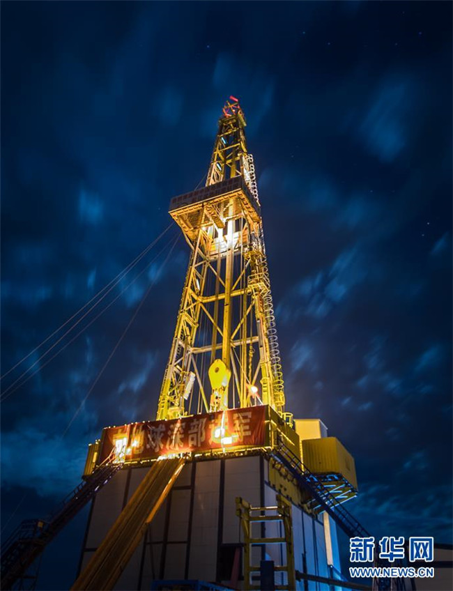 夜幕下的“地殼一號”萬米鉆機整機系統(tǒng)(2018年6月1日攝)。2018年6月2日,吉林大學主要承擔研發(fā)的“地殼一號”萬米鉆機正式宣布完成“首秀”:完鉆井深7018米,創(chuàng)造了亞洲國家大陸科學鉆井新紀錄,標志著我國成為繼俄羅斯和德國之后,世界上第三個擁有實施萬米大陸鉆探計劃專用裝備和相關技術的國家。 新華社記者 許暢 攝